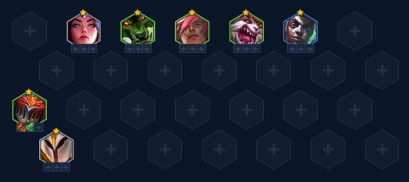 连败有同行可选择空城五连败,连胜情况下2-5升5,2-6升6,3-5拉7,期间也可用艾欧潜行过渡,火炮转让给2星劫过渡也比较舒服,或者用祖安枪手过渡。