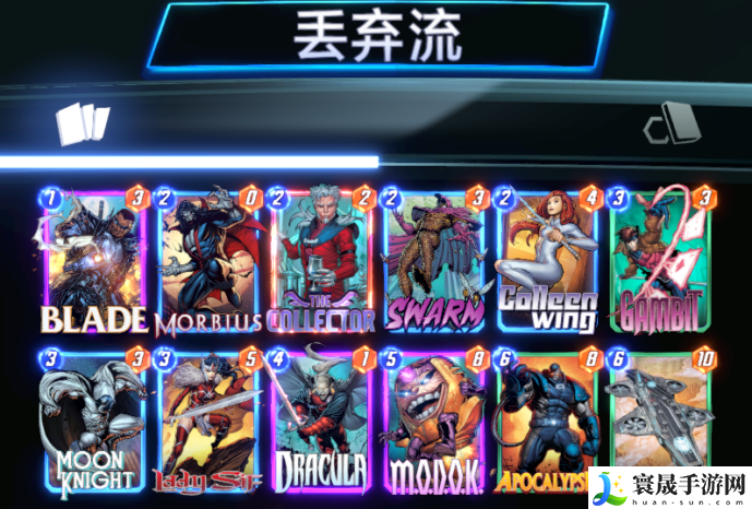 ①、传统丢弃流 首先笔者为大家推荐的是一套非常传统的丢弃卡组,不管是丢弃蜂群让你拥有数不尽的0-3,还是丢弃天启创造一个超级大哥,甚至丢弃神盾局的航空母舰,获得无数的随机卡,都会让人在丢弃的道路上欲罢不能,同时还能不断增加莫比亚斯和收藏家点数,可以说是强度与爽度并存的一套卡组。