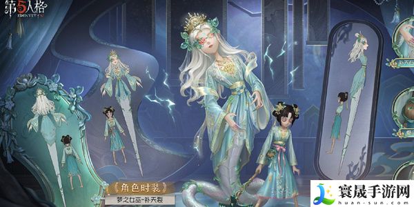 【奇珍时装】梦之女巫-补天裂,梦之女巫与其信徒均以DOU5战队标志色青蓝色调为主,头戴金色皇冠象征荣耀,散落的白色长发飘逸如云,青色的闪电纹路映照着她的面容,华美的襦裙上绣金线祥云,下缀翠玉白珠。纤细的双手有着被补天石侵蚀的痕迹,即使困难重重,也要奋不顾身地勇往直前。下身的银色鳞片隐隐藏着青色的电光,身旁的信徒头戴花饰,浅粉丝带束着一身轻衣,腰间枝条裹着一个饱满的椰子,如碧海般蓝澈的裙摆沾染上洪流携来的泥浆,却也无法阻挡她前进的步伐。一把因开采奇石而散发着流光的锄头上缠绕着青藤,正因细心耕耘,才有枯木逢春。
