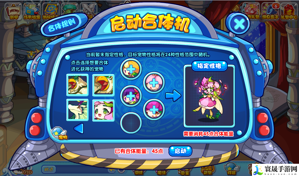 收集对应能量点数就可以启动一次合体机(能量点根据宠物进阶登记不同而变化),截至目前,只有多灵主、兽王塔尔、紫魅迪娜、暴走奎因、圣灵草王等加入套餐(注:合成性指定性格需要额外消耗180点能量,为合体能量的四倍)。