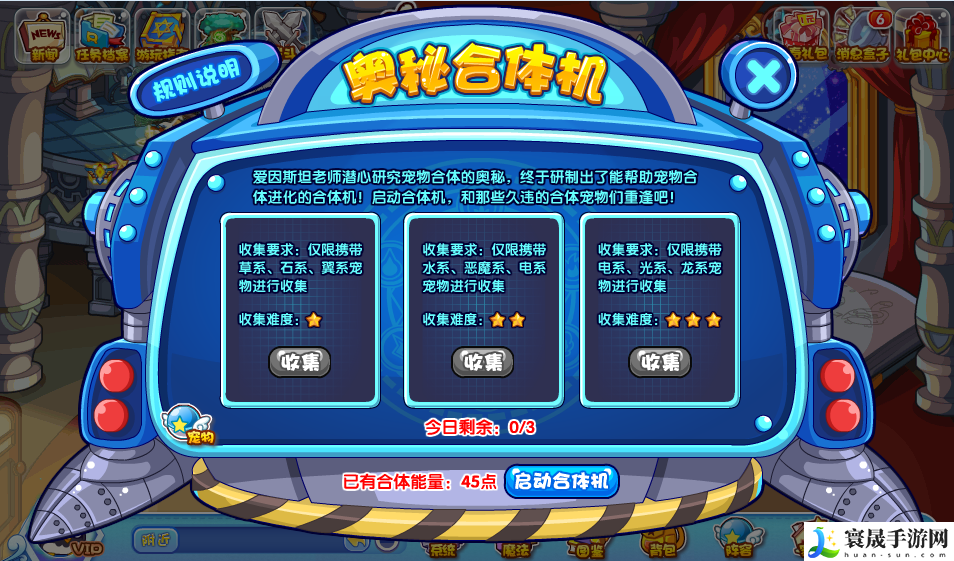 合体机总共有三个任务可供选择,任务均限制了宠物属性进行挑战,收集难度越高,战胜后所获得的合体能量越多,每日有三次机会,三星难度单次5点,一天最高15点。推荐三星收集难度进行挑战!