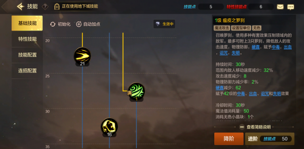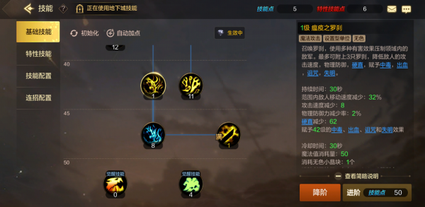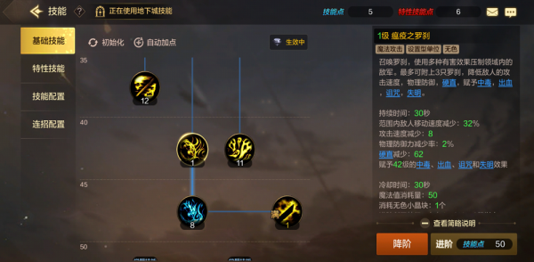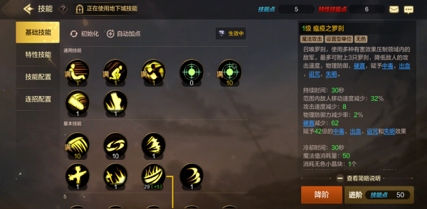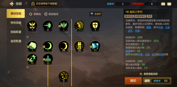 三段斩1级、裂波斩10级、十字斩1级、银光落刃1级、格挡1级、刀魂之卡赞1级、侵蚀之普戾蒙3级、瘟疫之罗刹1级。