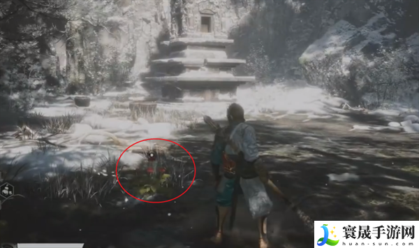5、走到柱子前面,可以看到地板上草地里有个可互动点。