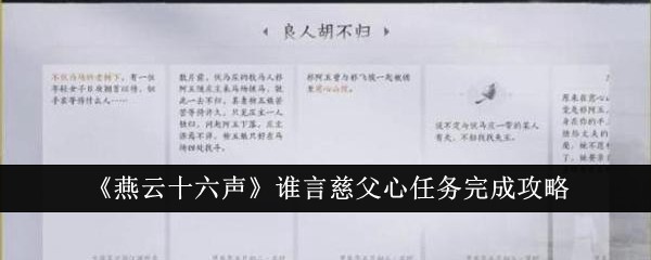 以上就是小编整理带来的燕云十六声谁言慈父心任务完成攻略,更多相关游戏攻略,请关注本站!
