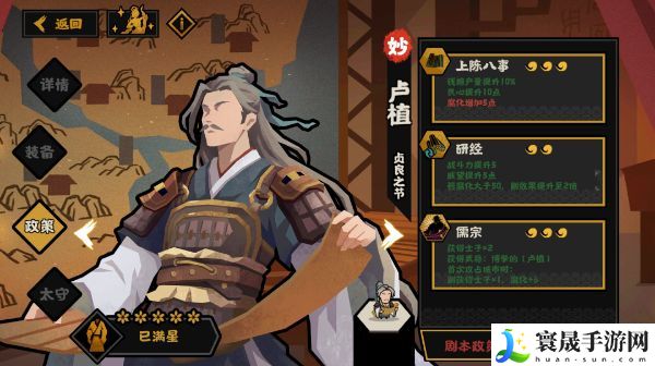 卢植这个除了武将,额外给了两个效果,一个是两个士子,一个是每次攻占一座城获得一个士子和六点腐化(腐化可以用来维持二政策)。