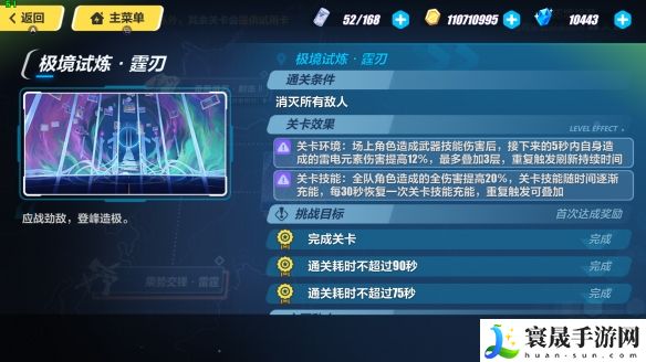 「极境试炼·霆刃」关卡的被动效果造成武器技能伤害后,提高自身的雷电元素伤害。关卡中的敌人一共两波,第一波为3个星尘属性敌人,第二波为强敌贝纳勒斯。