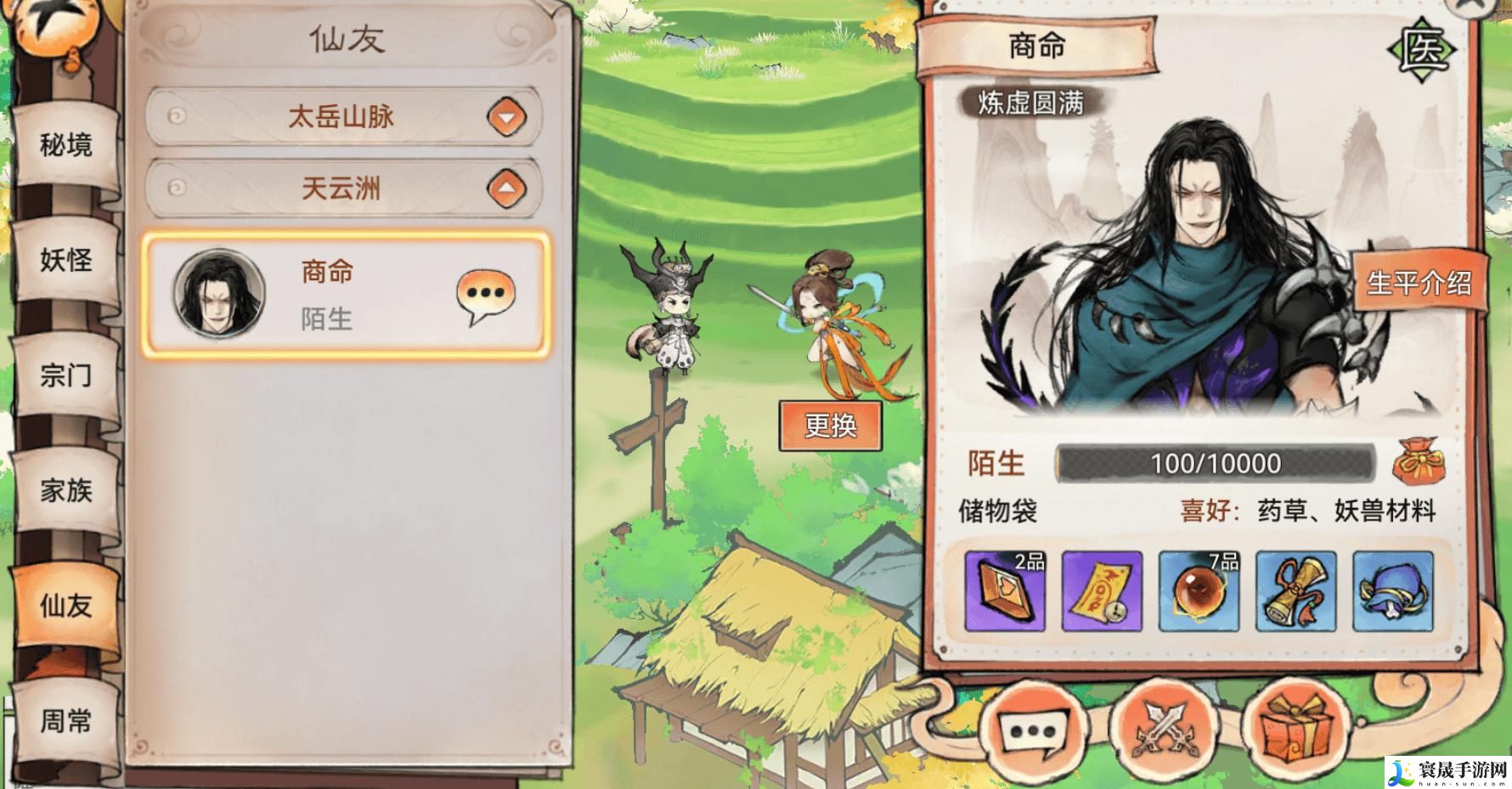 通过赠予物品也可以提高亲密度,根据仙友的喜好,赠予他们喜欢的物品可以更快地提高亲密度。每天赠送物品获取亲密度的上限为5000点。坏消息,亲密度是陌生。好消息,喜好是药草(=^▽^=)虽然说咱们和商命仙友不太熟,但是咱们作为种田大户,小清瑶我更是培植奇才,药草什么的根本不在话下!