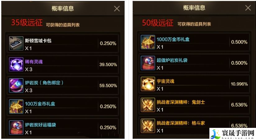(2)其中35级远征匣子有几率开出来100万金币礼盒或100个炉岩炭(概率为0.25%),50级的远征匣子有几率开出来1000万金币或1000个炉岩炭(概率为0.5%)。