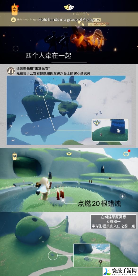 「四人牵手组队」四个人牵在一起,也可通过在【霞谷表演季剧场右边洞口的火盆旁】或【禁阁庇护所向导对面方罐子旁】打坐重温对应季节任务完成。