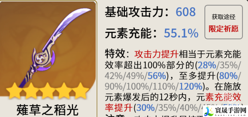 3、香菱的武器选择薙草之稻光,这也是最适合香菱的一把武器,在没有薙草之稻光的情况下可以选择四星武器渔获。