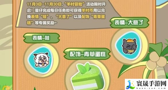 1、完成活动内的每日任务可获得羊村币,进而可以兑换表情-哇、大意了,以及配饰-青草蛋糕。