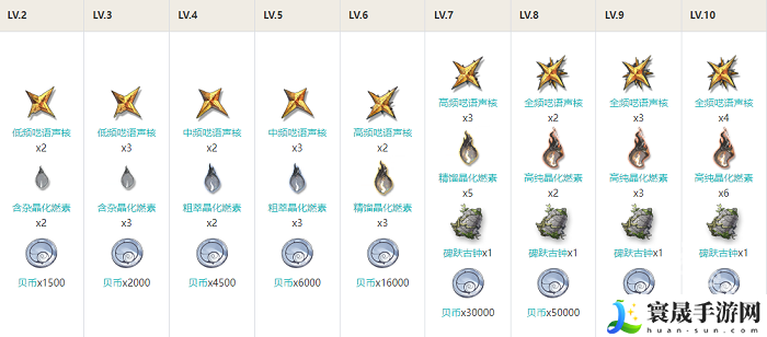 Lv10:全频呓语声核x4+高纯晶化燃素x6+碑趺古钟x1+贝币x100000