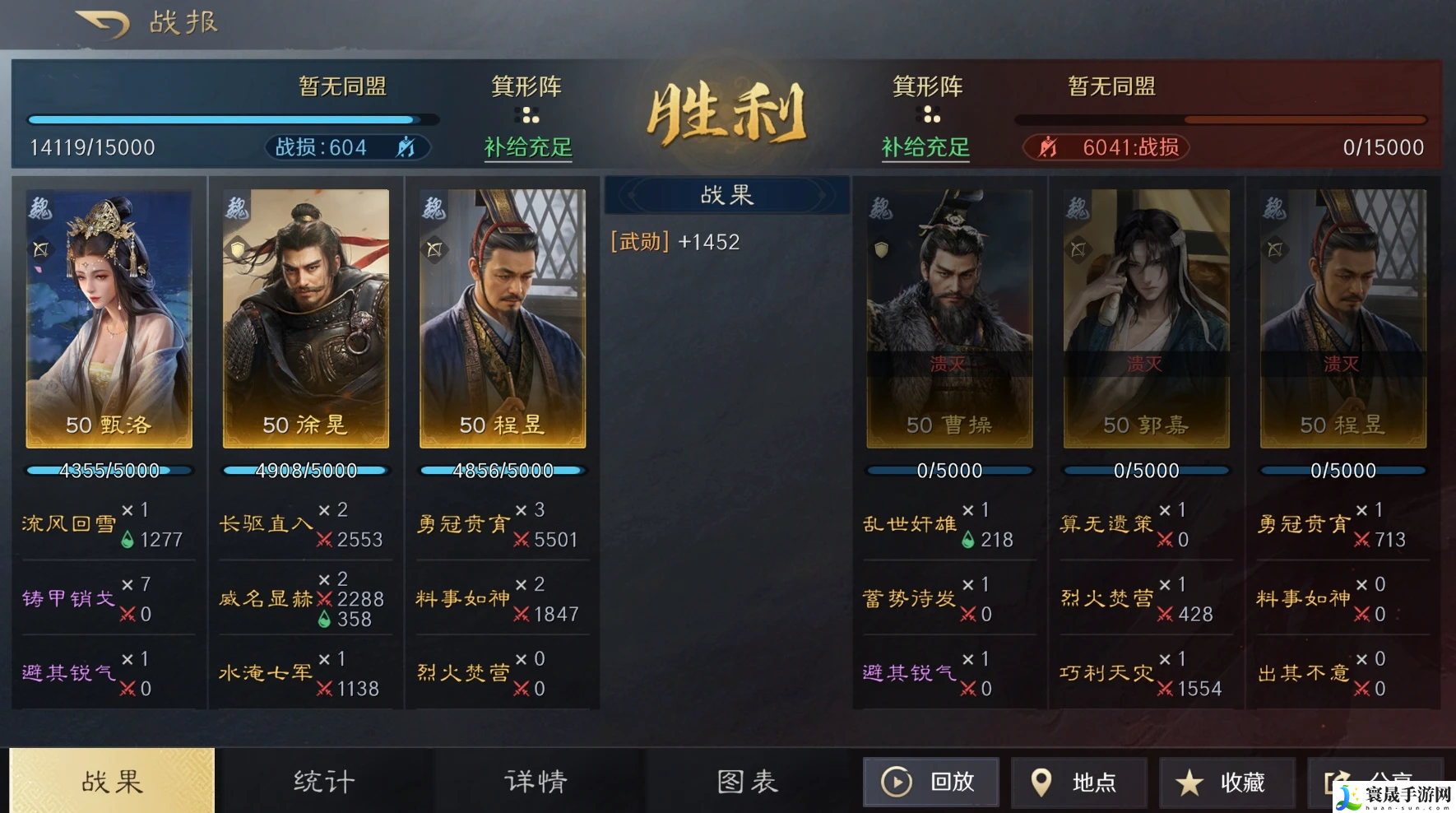这个阵容是以施加多种负面状态达到低战损结束战斗为核心,徐晃和程昱多种控制限制敌人的同时,配合甄洛的会心效果,可以快速打出爆发。
