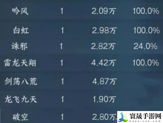“龙飞九天”“惊雷”“蔽日”这三个都是PVP向技能,伤害收益不高,所以不做统计。