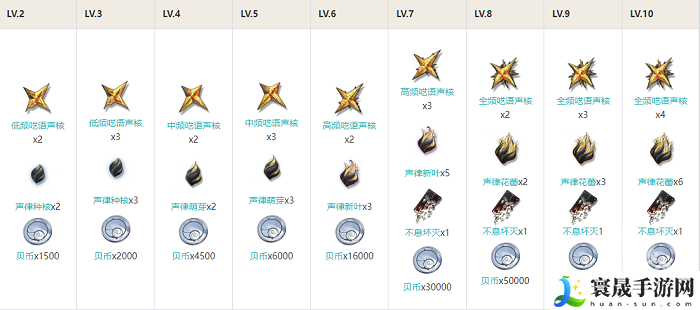Lv10:全频呓语声核x4+声律花蕾x6+不息坏灭x1+贝币x100000