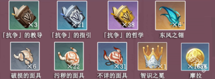 1、琴的天赋突破材料抗争的哲学需要16个、不详的面具需要6个、东风之翎需要2个。