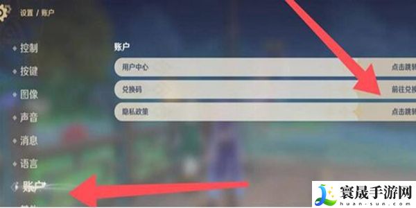 3、进入之后在左边栏找到并点击账户,然后在点击兑换码;