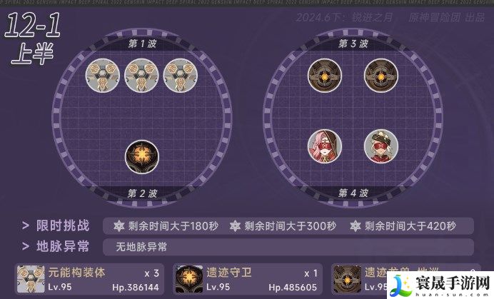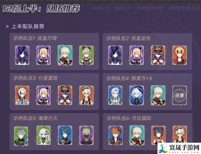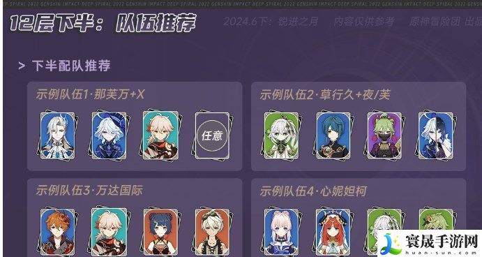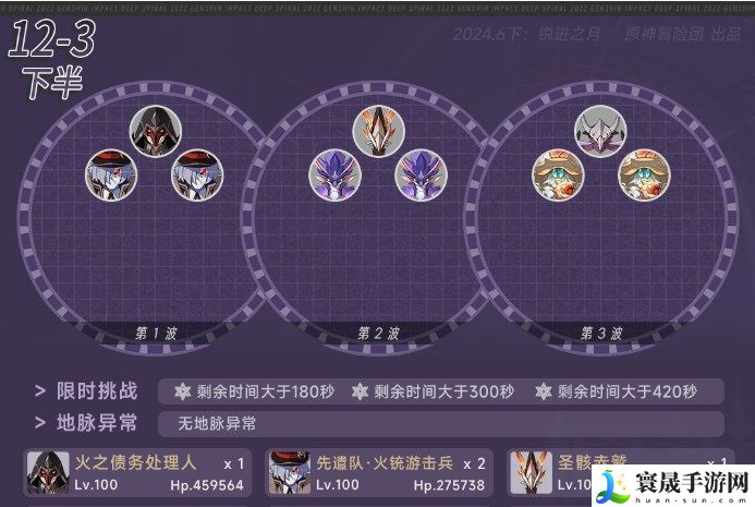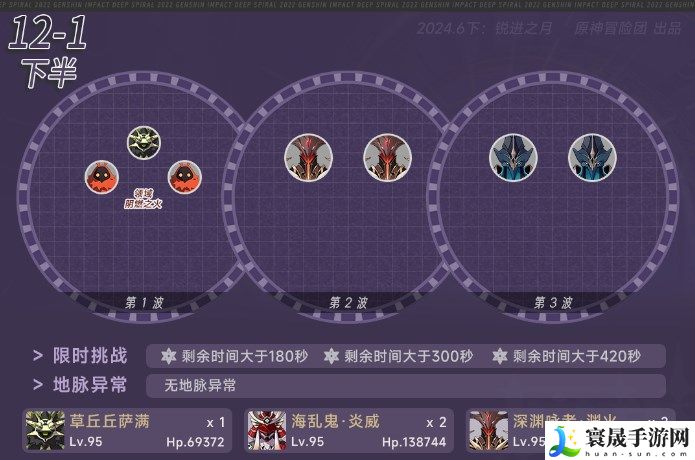 本期深渊上半总体要求不高,但是注意12-1有高达4波的群怪,并且下半也有一定压力,避免选择转火能力差的队伍。练度较低时优先考虑携带雷元素角色的队伍应对12-3的矩阵。