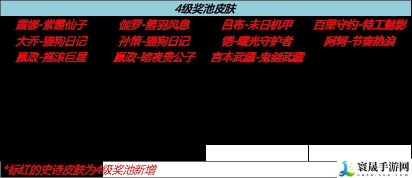 后续还可以通过升级奖池刷出4 级奖池中史诗皮肤,4 级奖池皮肤详情: