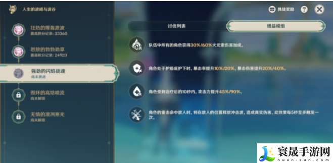 3. 总的来说,今天的关卡较为考验对群与攻坚能力,增益效果为对火元素、护盾下的角色、以及受治疗等效果存在增幅。
