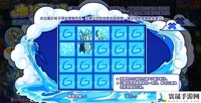 我们需要在方格内寻找到任意的螃蟹,单次寻找里只有12次点击方格的机会,宠物的大小刚好占据4个格子,小洛克们可以通过该提示进行判断,更方便找到。12次机会用完就会结束本次寻找。每天仅有两次寻找的机会。