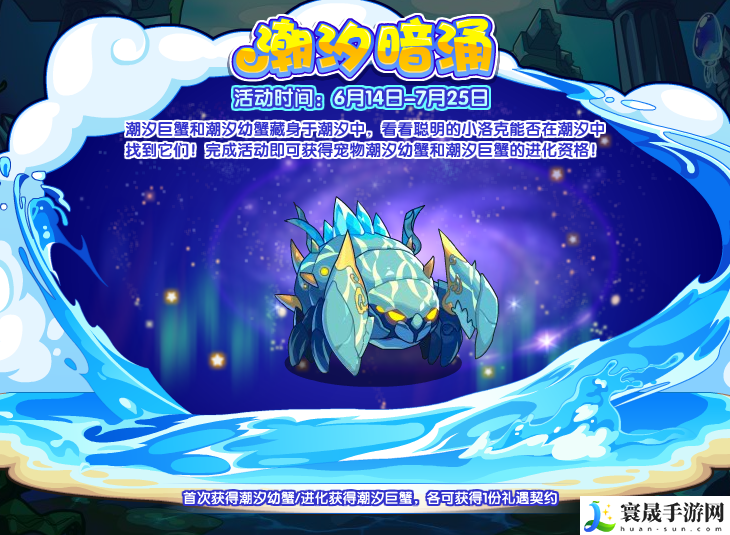 累计获得50点活动进度,可以领取:潮汐巨蟹;累计获得100点活动进度则解锁:潮汐巨蟹 进化资格!领取/解锁进度可能会重置,具体以游戏为准。