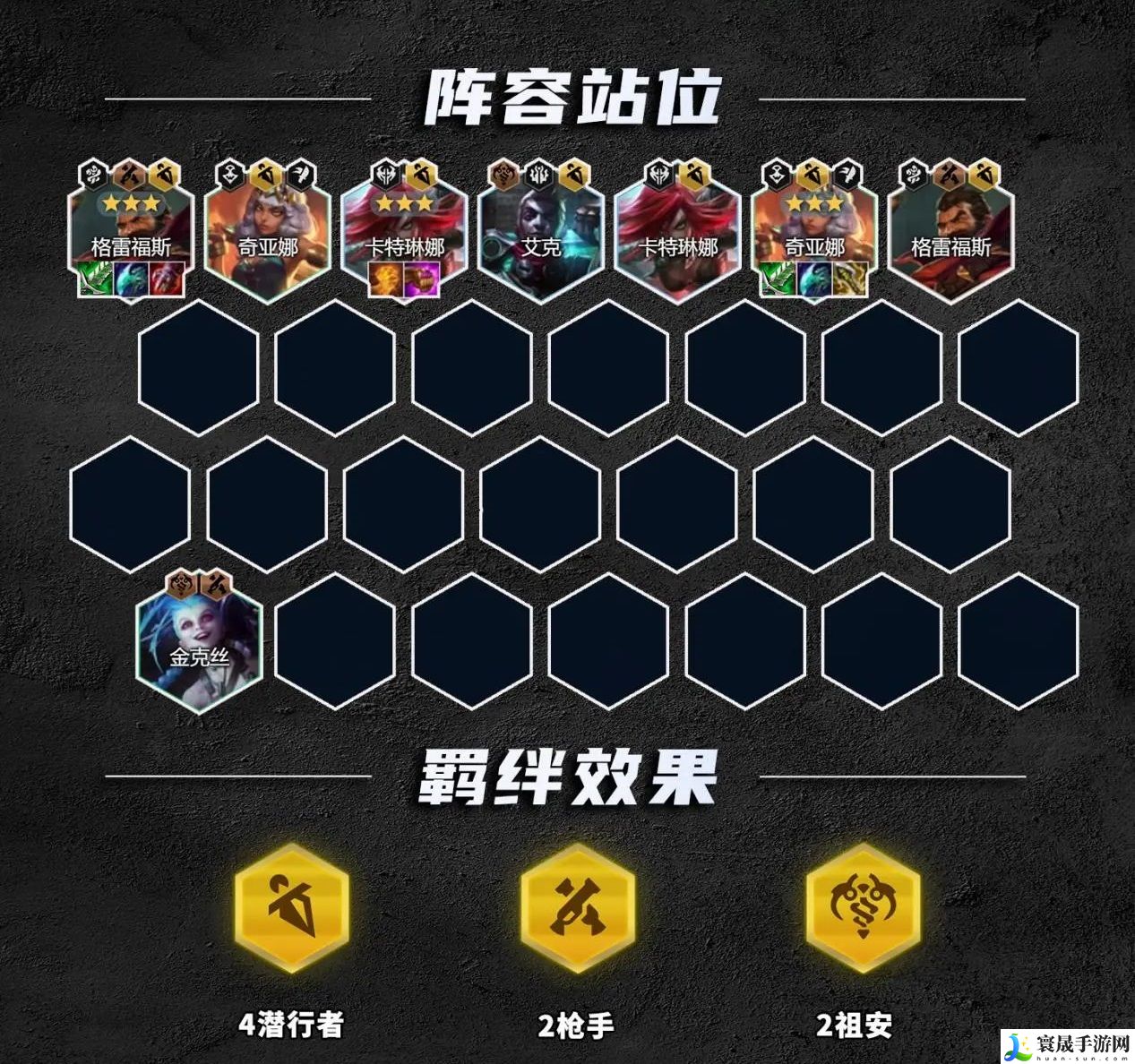 这套阵容主要玩的是4潜行者格雷福斯,在拿到好事成双符文的时候,对于多输出棋子的阵容提升特别大,特别是开4潜行羁绊后在上了2个相同的棋子,在好事成双符文提供的属性加持下,能让全员化为副c,输出爆炸。