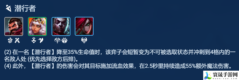 4潜行者羁绊触发后能短暂获得一个类似夜刃的效果(不可选取),这样就能相当于获得一个短暂的小无敌,同时还能跳4格范围内最远的棋子,对敌方后排产生较高的威胁,在4潜行行羁绊下造成伤害时还能造成一个额外的流血效果增加输出。