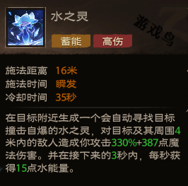 效果:在目标附近生成一个会自动寻找目标撞击自爆的水之灵,对目标及其周围4米内的敌人造成你攻击330%+387点魔法伤害。并在接下来的3秒内,每秒获得15点水能量。