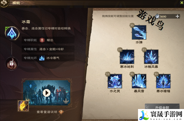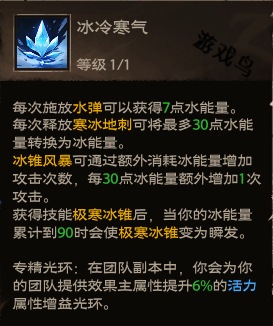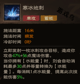 效果:立即发射一枚冰刺攻击目标,造成你攻击47%+56点魔法伤害。当你拥有【水能量】时,则会自动消耗最多30点并等量转换为【冰能量】。每消耗1点水能量,提高此次技能伤害5%。