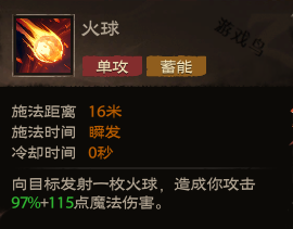 效果:向目标发射一枚火球,造成你攻击97%+115点魔法伤害。