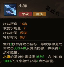 效果:发射2枚水弹攻击目标,每枚水弹造成你攻击33%+40点魔法伤害,并获得7点水能量。