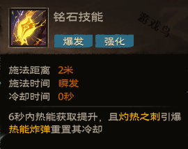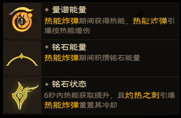 铭石状态:6秒内热能获取提升,且灼热之刺引爆热能炸弹重置其冷却
