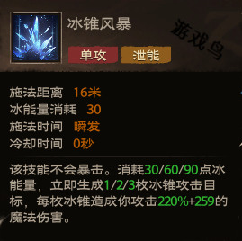 效果:该技能不会暴击。消耗30/60/90点冰能量,立即生成1/2/3枚冰锥攻击目标,每枚冰锥造成你攻击220%+259的魔法伤害。