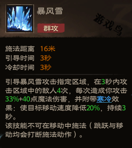 效果:引导暴风雪攻击指定区域,在3秒内攻击区域中的敌人4次,每次造成你攻击33%+40点魔法伤害,并附带寒冷效果:使目标移动速度降低20%,持续3秒。