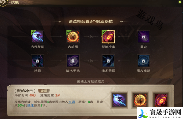 效果:发出火焰波,将你周围4米范围内敌人击退,距离:8米,并造成50%的减速效果5秒。