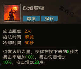 效果:引发火焰力量,使你在接下来的8秒内暴击率增加10%,暴击伤害增加10%,攻击增加28点。