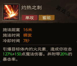 效果:引爆目标体内的火元素,造成你攻击127%+150点魔法伤害。并附带20%的暴击率。