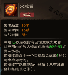 效果:吟唱1.5秒后在指定区域生成火龙卷对范围内的敌人造成你攻击80%+93点魔法伤害。