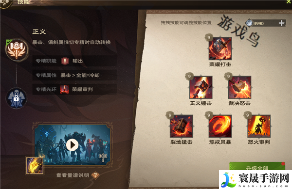 审判·正义强化:命中后会进行一-次追击(追击也可触发该技能相关天赋效果)。