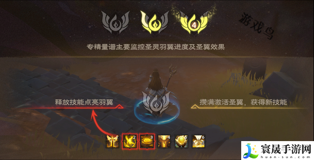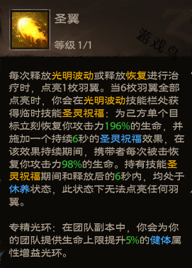 效果:每次释放光明波动或释放恢复进行治疗时,点亮1枚羽翼。当6枚羽翼全部点亮时,你会在光明波动技能栏处获得临时技能圣灵祝福:为己方单个目标立即恢复你攻击力196%的生命,并施加一个持续6秒的圣灵祝福效果,在该效果持续期间,携带者每次被击恢复你攻击力98%的生命。持有技能圣灵祝福期间和释放后6秒内,均处于休养状态,此状态下无法点亮任何羽翼。