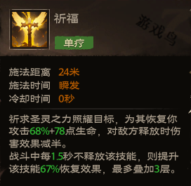 效果:祈求圣灵之力照耀目标,为其恢复你攻击68%+78点生命,对敌方释放时伤害效果减半。