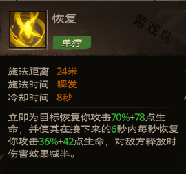 效果:立即为目标恢复你的攻击70%+78点生命,并使其在接下来的6秒内每秒恢复你攻击36%+42点生命,对敌方释放时伤害效果减半。