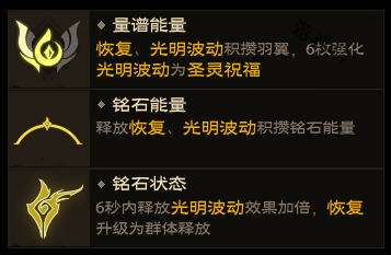 6、量普介绍:恢复、光明波动积攒羽翼,6枚强化光明波动为圣灵祝福。释放恢复、光明波动积攒钻石能量。6秒内释放光明波动效果加倍,恢复升级为群体释放。