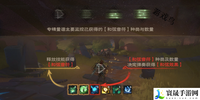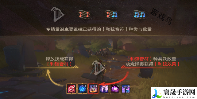 效果:每次施放音符技能都会在乐谱上留下一枚音符,当音符达到2枚时你的和弦谱曲会根据对应组合(无关音符顺序)施放不同的和弦技能。