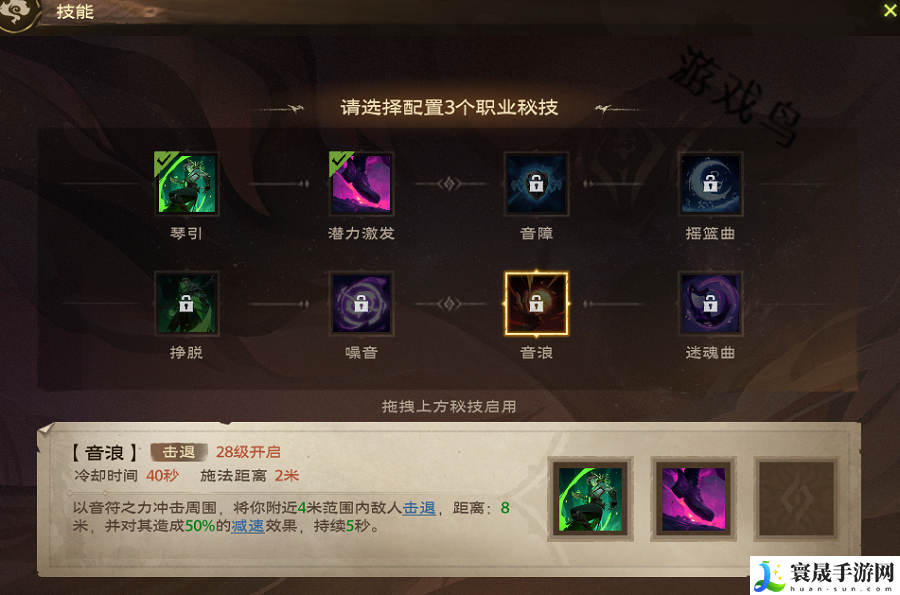 效果:以音符之力冲击周围,将你附近4米范围内敌人击退,距离:8米,并对其造成50%的减速效果,持续5秒。