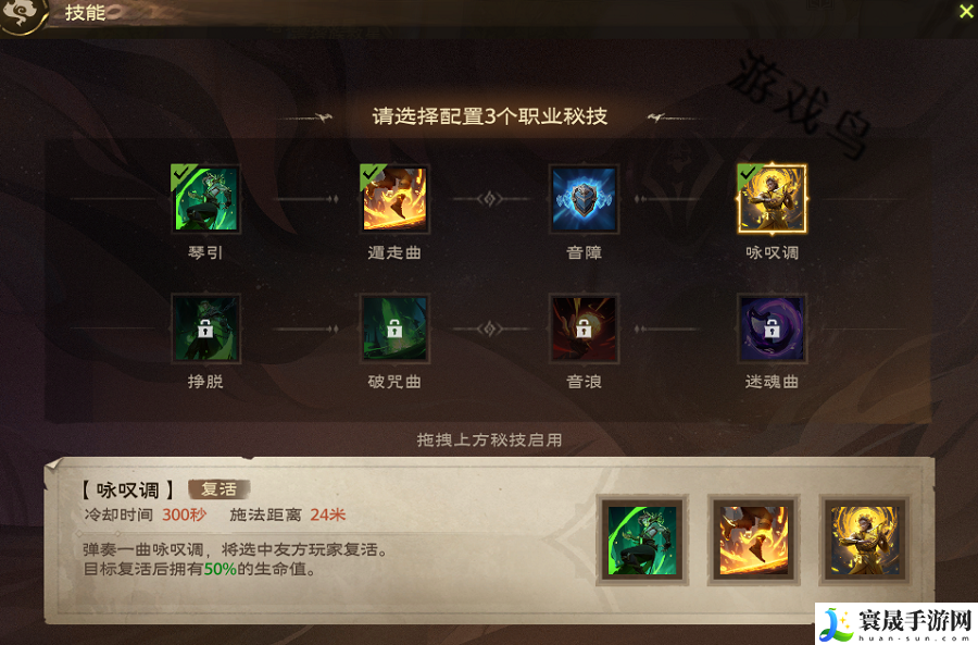 效果:弹奏一曲咏叹调,将选中友方玩家复活。目标复活后拥有50%的生命值。