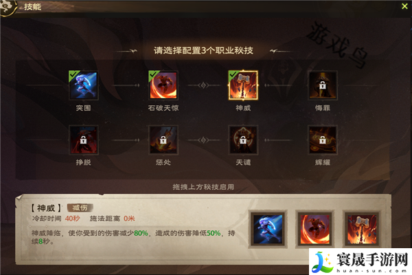 效果:神威降临。使你受到的伤害减少80%。造成的伤害降低50%,持续8秒。