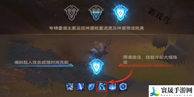 6.量谱介绍:偏斜敌人攻击或随时间推进获得神盾能量,累积100点强化飞盾。获得神盾能量的同时积攒铭石能量。6秒内释放除飞盾外的技能必定重置飞盾冷却。