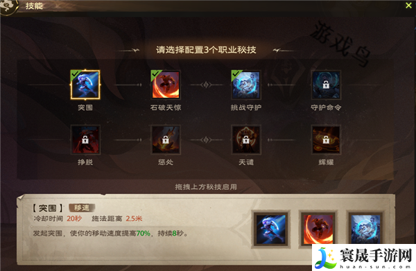 效果:发起突围,使你的移动速度提高70%,持续8秒。